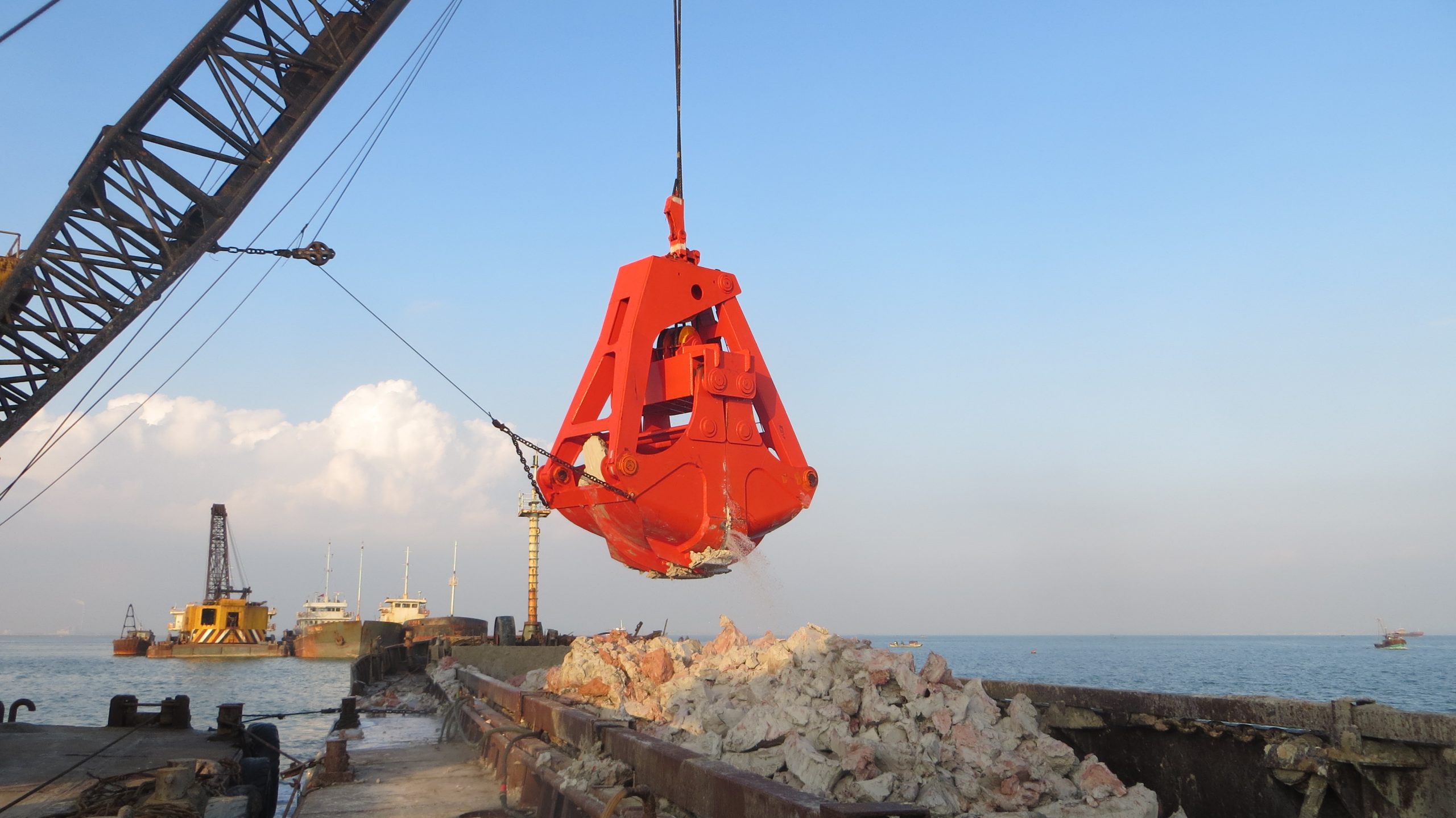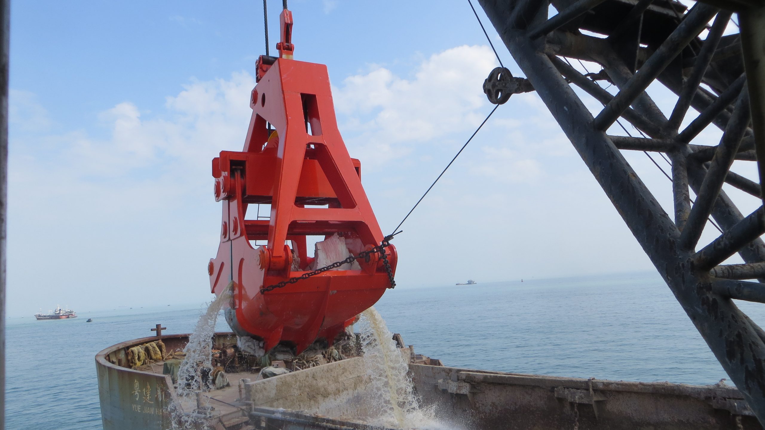 Dredging 2-rope clamshell grab is a kind of effective tool underwater for handling mud, hard clay, iron sand, blasting rocks. Grab feature is with high production efficiency, strong and durable, easy maintenance, competent to operate in harsh operating conditions. There are multiple seals to prevent sand and water entering into sheaves. After years of research, we have series of products, the capacity from 6t to 200t. This type of grab can be fit with single, two or four cable cranes.